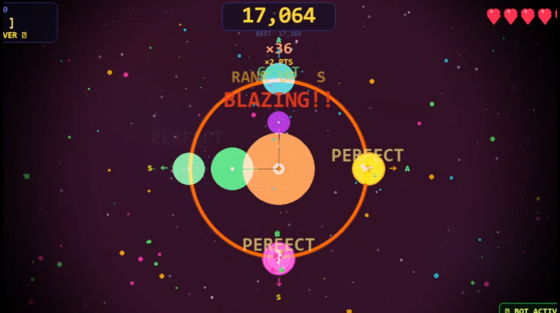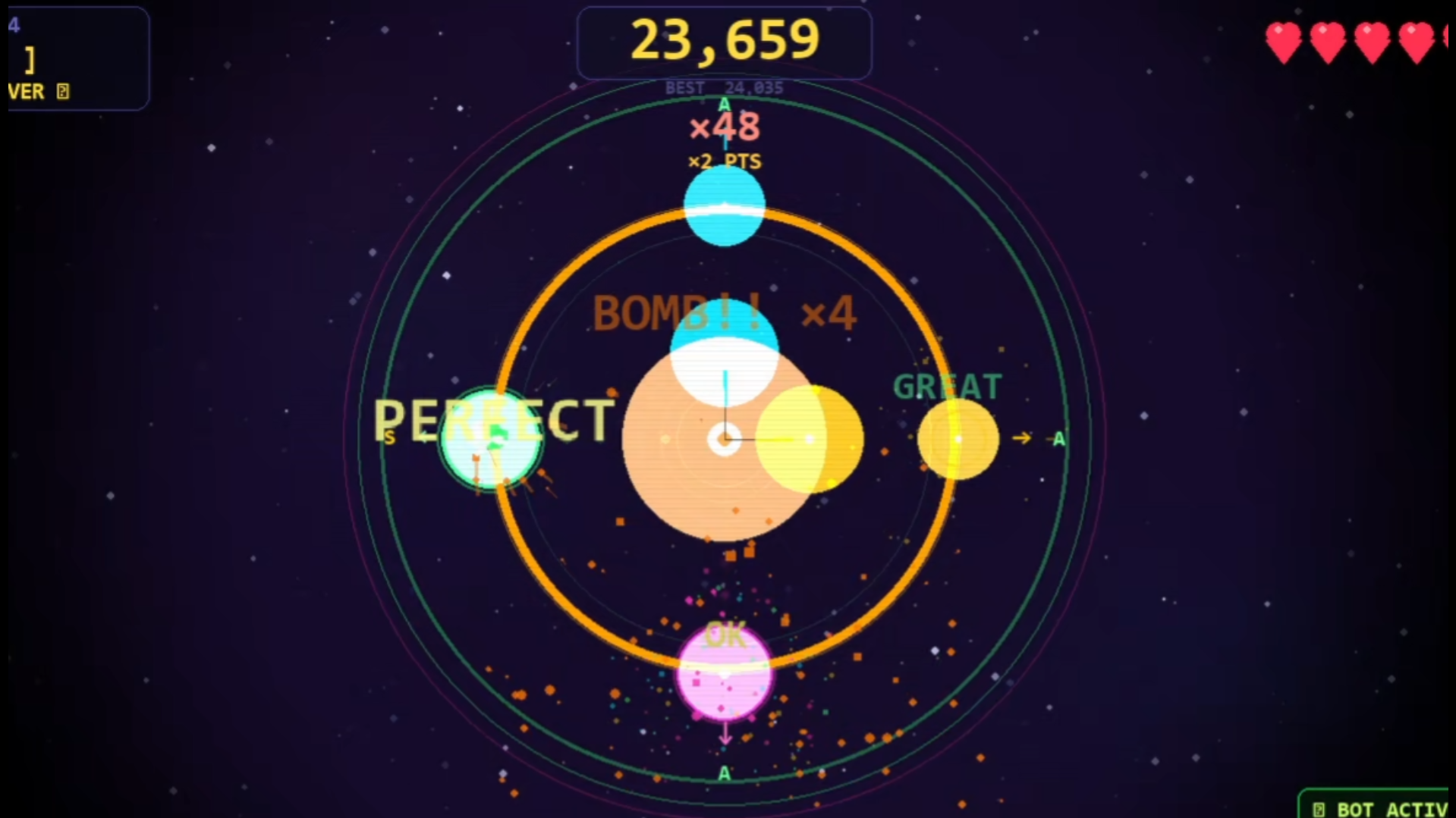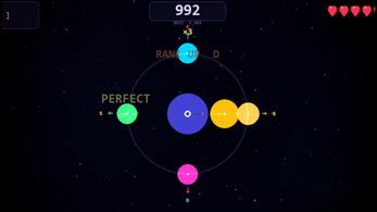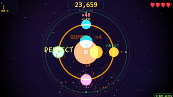 A fast-paced rhythm action game set in space where beats fly in from all four directions and you have to hit them exactly as they cross the ring. Miss too many and you're done.
