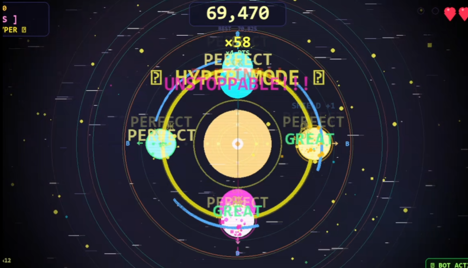 Combo system Chain hits without missing to build your multiplier. Hit ×20 and you enter Fever Mode (2× points). Push to ×55 and Hyper Mode kicks in 4× points, warp-speed stars, and the whole screen goes electric.
