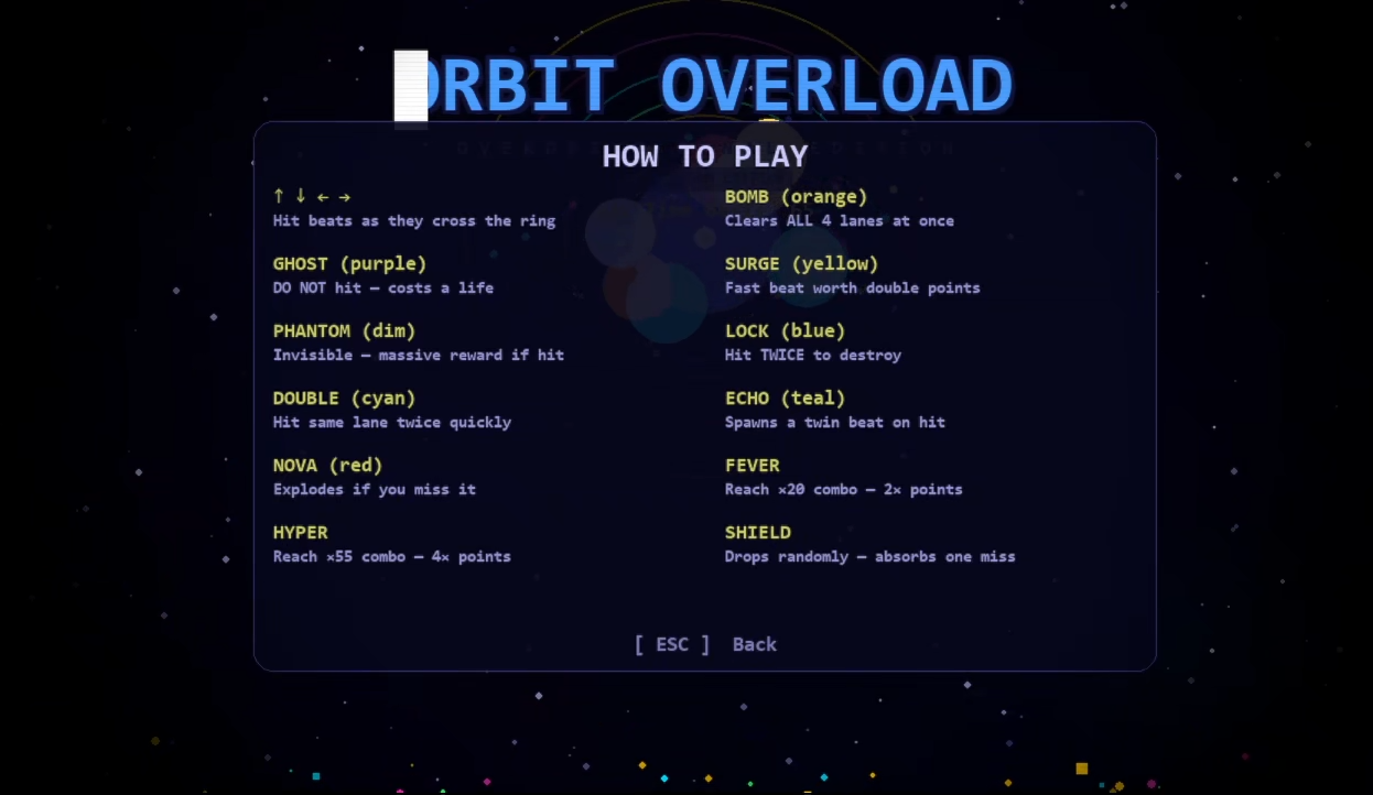 How it works Arrow keys. Four lanes. Beats travel inward, hit them as they reach the ring. Simple to pick up, genuinely hard to master at higher levels.